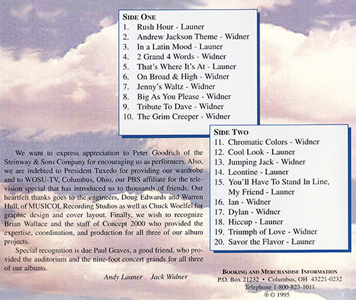 Jack and his musical partner, Andy Launer, formed an extraordinary two-piano duo called "The Andrew Jackson Pianoforte." This act not only featured world class piano playing, but also incorporated humor. The following are excerpts from a concert recorded in 1996 so the quality is not great by today's standards, but it is certainly worth watching.